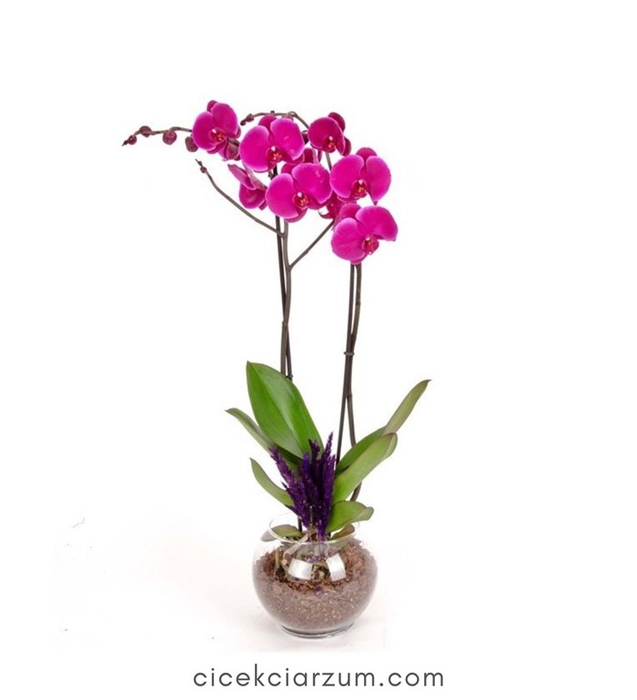 Çiçekçi Arzum'un özenle seçilmiş, fuşya rengindeki çift dal orkidesi, zarafetin ve kalitenin mükemmel bir yansımasıdır. Uzun ömürlü ve en taze haliyle hazırlanan bu göz alıcı tasarım, bulunduğu ortama anında sofistike bir şıklık katacaktır. Akvaryum cam vazo içerisindeki canlı kök yapısı ve mor ek süslemeleri ile fark yaratan bu aranjman, duygularınızı en asil şekilde ifade etmenizi sağlar. Sevdiklerinize duyduğunuz derin hayranlığı ve saygıyı kalıcı kılacak bu zarif hediye ile şimdi unutulmaz bir anı yaratın.