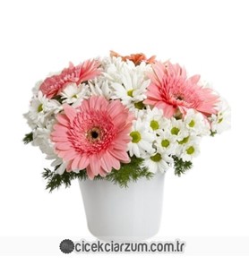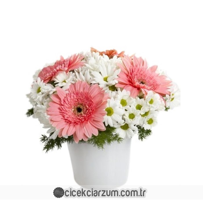 Seramik vazoda pembe gerbera ve beyaz krizantemlerden oluşan aranjman